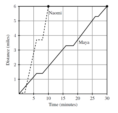 After school, Maya and Naomi headed to the beach, 6 miles away. Maya decided to bike while Naomi took a bus. The graph below shows their journeys, indicating the time and distance traveled. What was the difference, in miles per hour, between Naomi’s and Maya’s average speeds?
