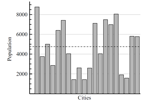 There are 20 cities in the County of Stephton. Their populations are shown in the bar chart below. The average population of all the cities is indicated by the horizontal dashed line. Which of the following is closest to the total population of all 20 cities?